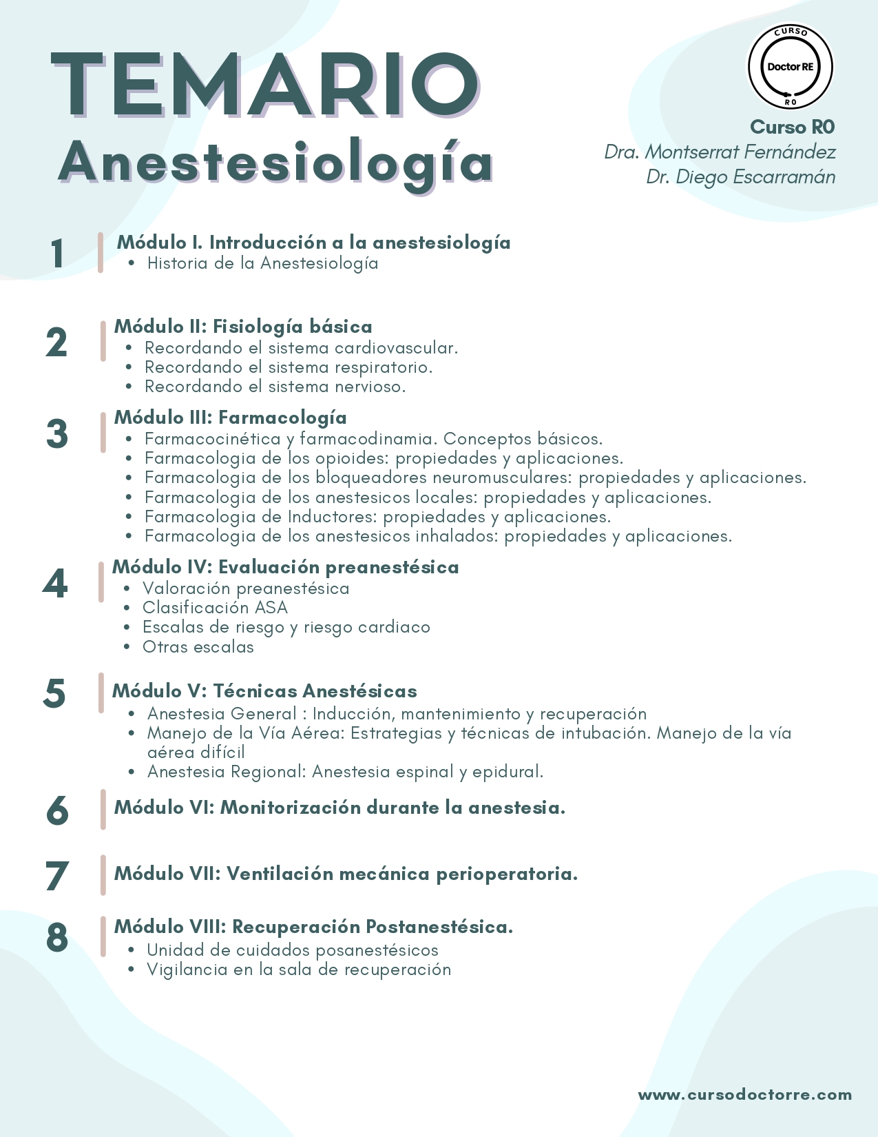 ¡Prepárate para el quirófano! Este Curso R0 te lleva de cero a lo esencial en Anestesia. Domina la farmacología que usarás a diario (opioides, inductores, inhalados), aprende a realizar una valoración preanestésica (ASA) y domina las técnicas clave como el manejo de la vía aérea y la anestesia regional. Este temario cubre todo el ciclo, desde la fisiología hasta la recuperación postanestésica, dándote la confianza que necesitas para tu primer día de R1.