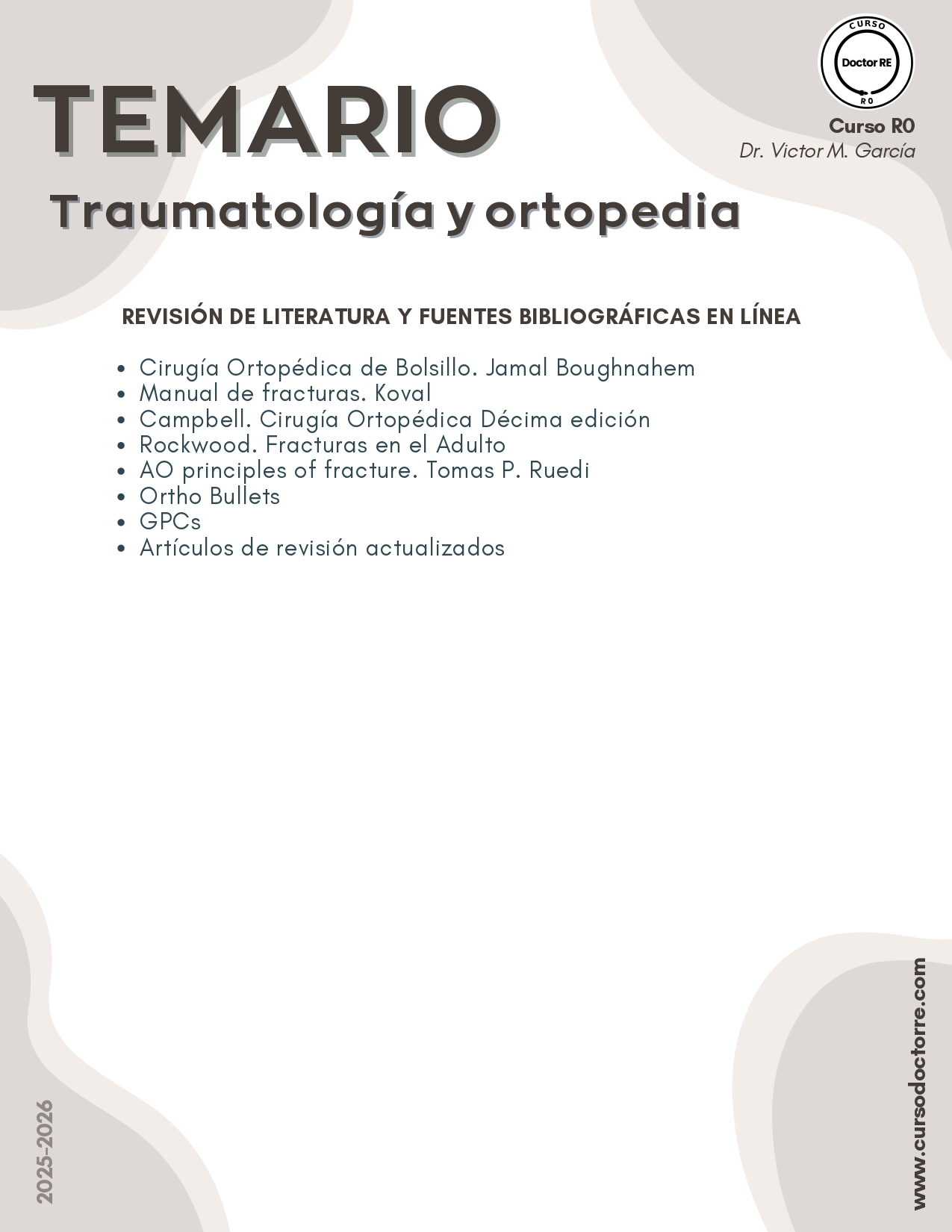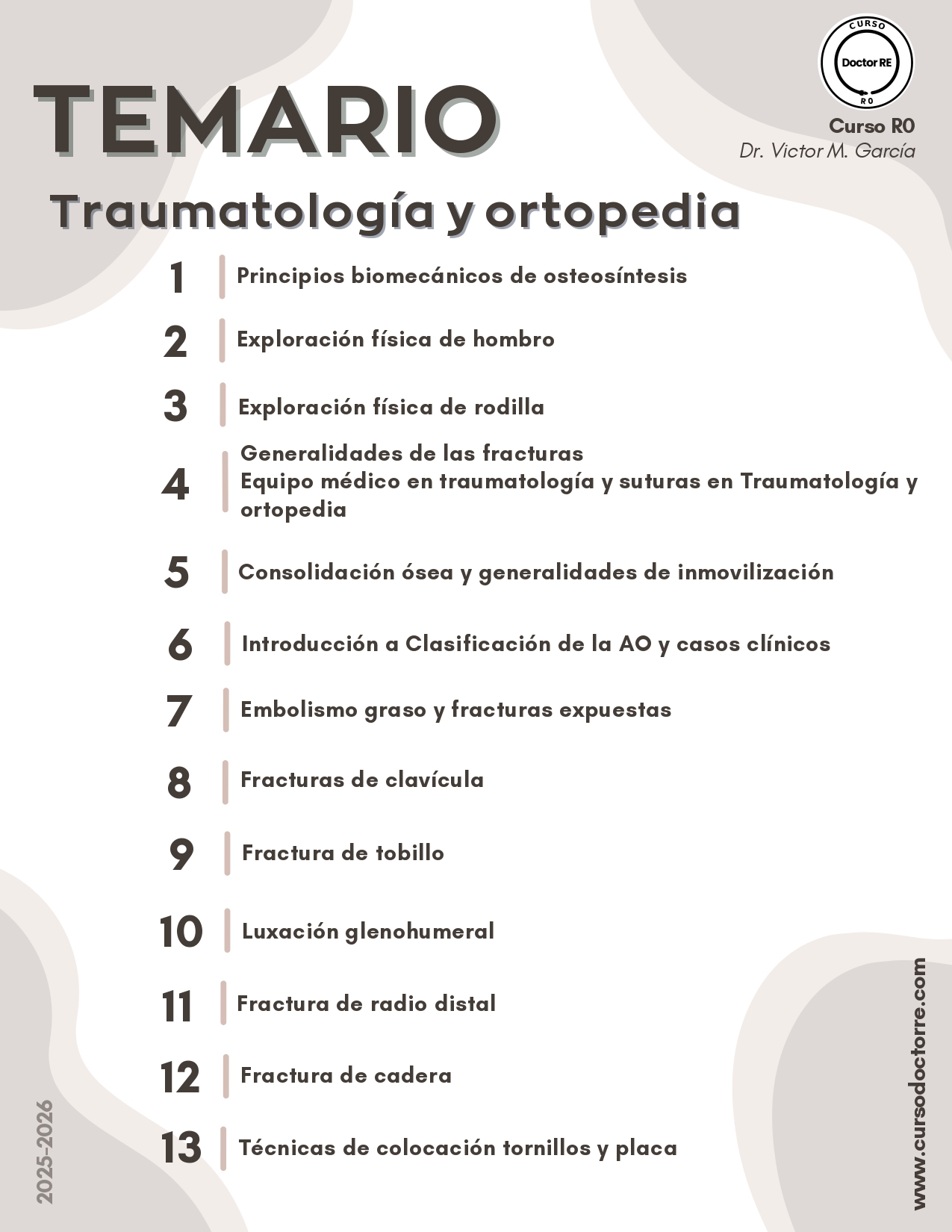 Este Curso R0 es tu entrenamiento intensivo para la sala de urgencias y el quirófano. Domina las habilidades prácticas del día uno: aprende la exploración física de hombro y rodilla , los principios de inmovilización y el manejo de fracturas expuestas. Nos enfocamos en lo que verás en tu primera guardia: fracturas de cadera , radio distal y tobillo. Aprende a "hablar el idioma" con la Clasificación AO y entiende los principios de osteosíntesis y suturas. ¡Llega listo para la acción!